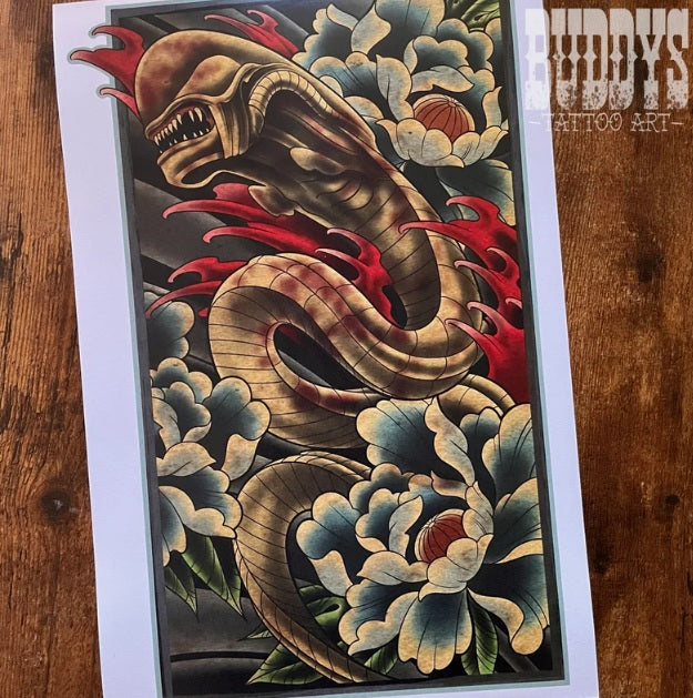 In Space no one can hear you scream.This artwork was inspired by traditional. Japanese tattoo designs with a little bit of my favorite movie monster mixed in!Print is 18x12 and printed on 100lb cover paper.