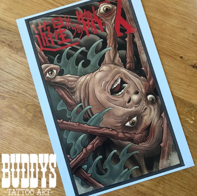 “You’ve got to be @#$%ing kidding me!”This artwork was inspired by traditional. Japanese tattoo designs with a little bit of my favorite movie monster mixed in!Print is 18x12 and printed on 100lb cover paper.