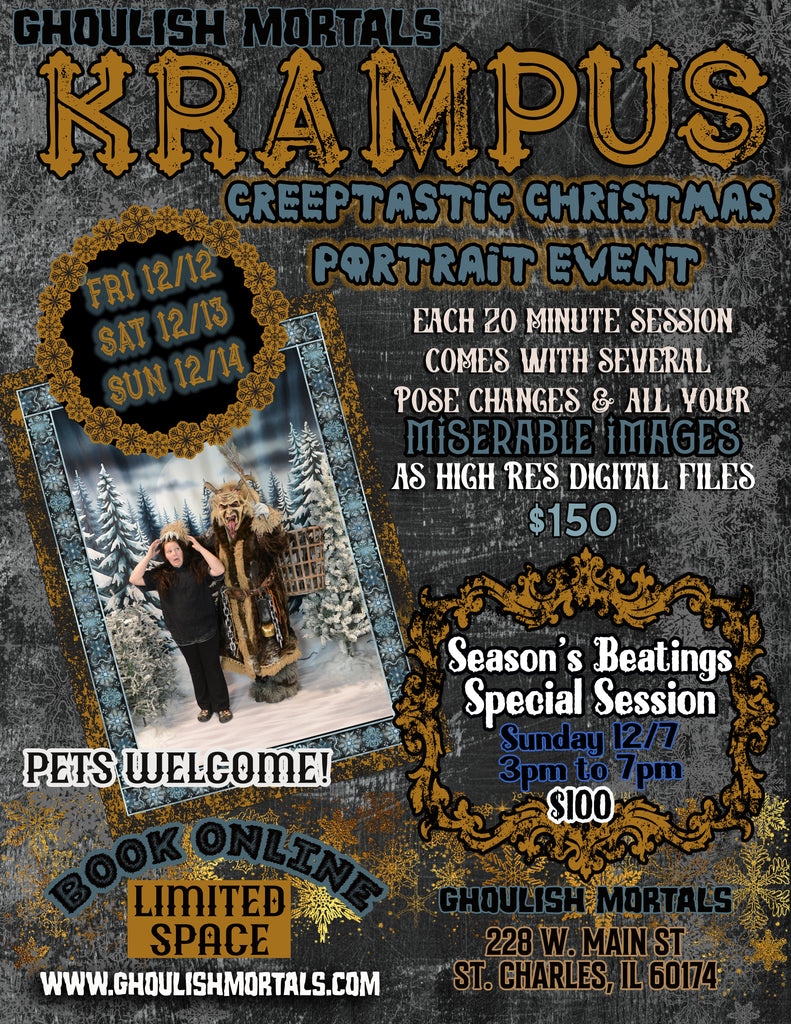 Your session includes several pose and prop combinations amongst your group during the 20 minutes of your session. Your photographer is Dove Thiselton, owner of Ghoulish Mortals and your Krampus is Alora, staff member extraordinaire.
