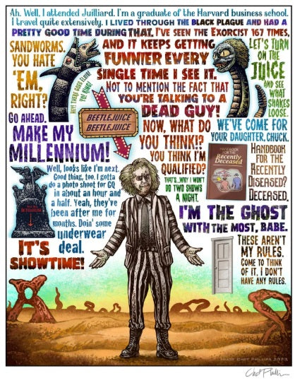 "BeetleJuice" tribute. Signed 11" x 14" print from an illustration by Chet Phillips. Signed on bright white archival 60 lb. paper.